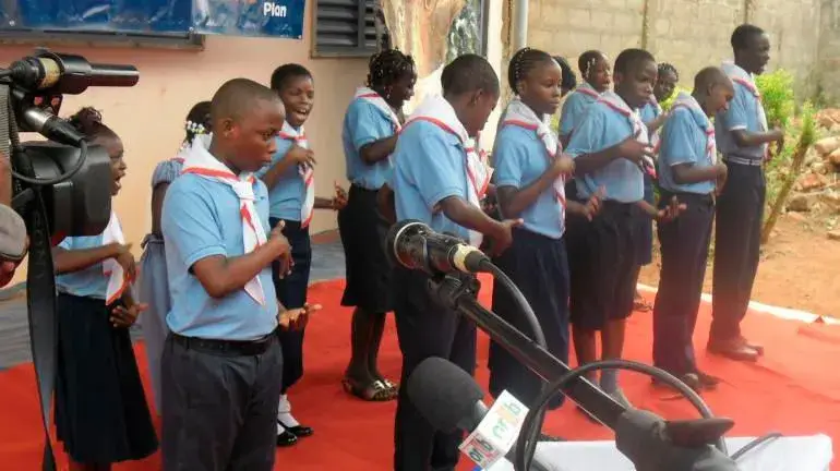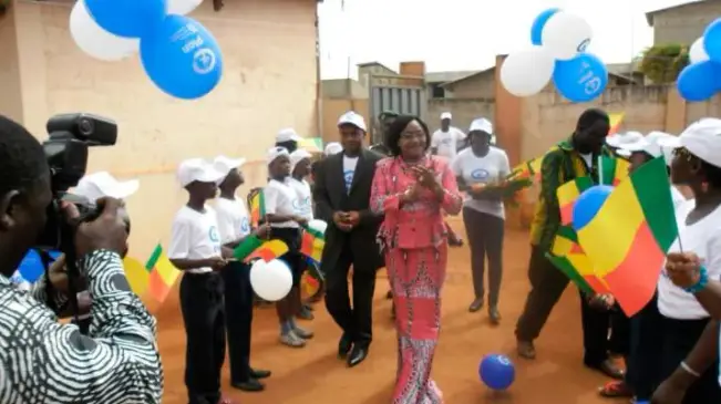 A son entrée, Madame le ministre a d’abord été impressionnée par l’accueil : la haie des petits enfants agitant les fanions à l’entrée de l’école, puis les élèves disposés dans la cour et sur les balcons tenant de petits ballons d’anniversaires marqués « Plan International ». Lors d’une discussion informelle que j’ai eue avec elle, elle m’a confié qu’elle n’avait jamais appris qu’il existait une pareille école au Bénin.