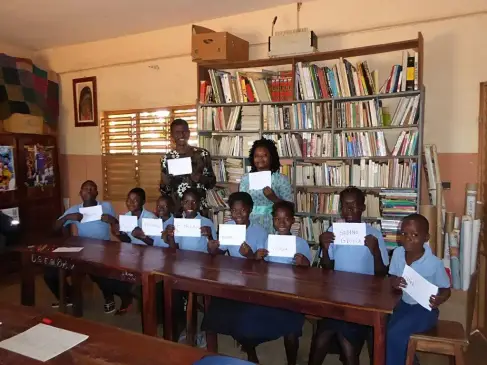 Tous les enfants parrainés par des personnes de Belgique ont été réunis en octobre 2015 pour une petite séquence video. Ils étaient 6 élèves sourds (Odette, Gloria, Victoire, Fiacre, Clément, Arnaud), plus la petite Gisèle (fille de René) et Martine qui a assuré l’interprétation puisqu’elle est entendante. Se sont adjoints 2 anciens filleuls : Kozime, qui est maintenant répétiteur pour les devoirs du soir et Marie-Claire, qui est en train de se former pour devenir la prochaine bibliothécaire.Tous deux sont payés par l’école pour ces activités pédagogiques.Enfin Lola Viel, une jeune française, est en mission volontaire pour 6 mois (venue par la DCC) : elle nettoie et réorganise la bibliothèque, encode les livres sur un logiciel informatique et forme Marie-Claire, la nouvelle bibliothécaire qui,par son intermédiaire, a bénéficié d’un stage au centre culturel français de Cotonou.