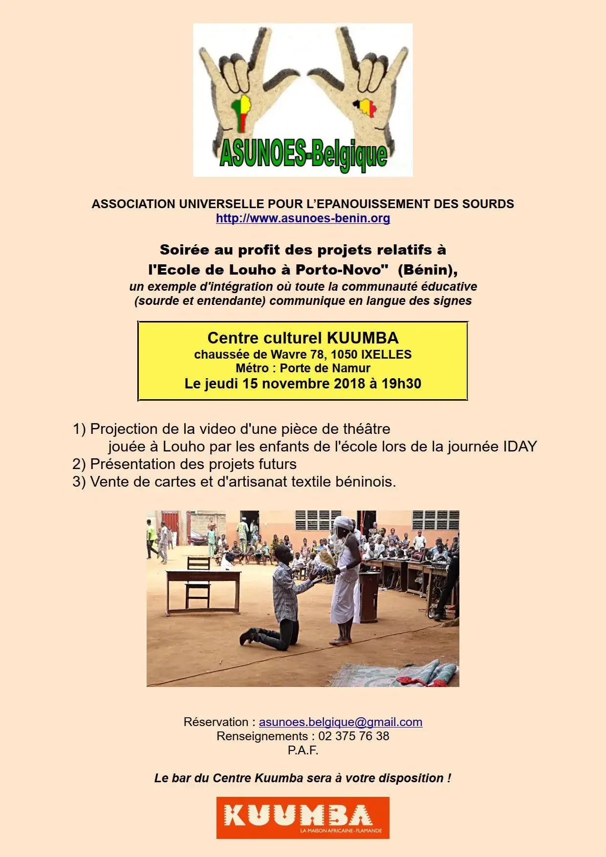 ASUNOES-Belgique organise le 15 novembre 2018 à Bruxelles une soirée d’information au cours de laquelle sera projetée une vidéo de la pièce de théatre « Justice revendiquée », jouée par les enfants de l’école lors de la journée IDAY (International Day for African Youth) le 16 juin 2018.