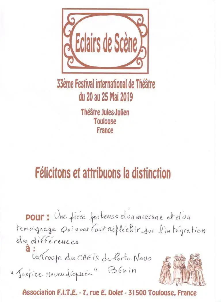 Il y a avait un projet que nous pensions ne pas pouvoir mener à bien faute de financement, c’est la participation à la 33ème édition du Festival International de Théâtre « Éclairs de Scène » à Toulouse où la troupe de théatre du CAEIS a été sélectionnée pour participer du 20 au 25 Mai 2019 (comme en 2017) : http://www.asunoes-benin.org/articles/le-sournal-numerique/tournee-artistique-du-caeis-en-france-et-en-belgique. Or, très tardivement, le Directeur de l’Ecole a été avisé d’une prise en charge spéciale des billets d’avion par la Fondation Claudine Talon ainsi que d’une aide financière du Ministère de tutelle.